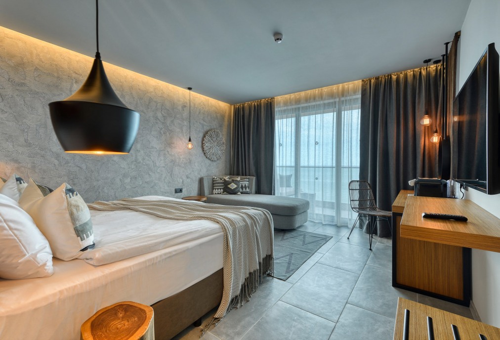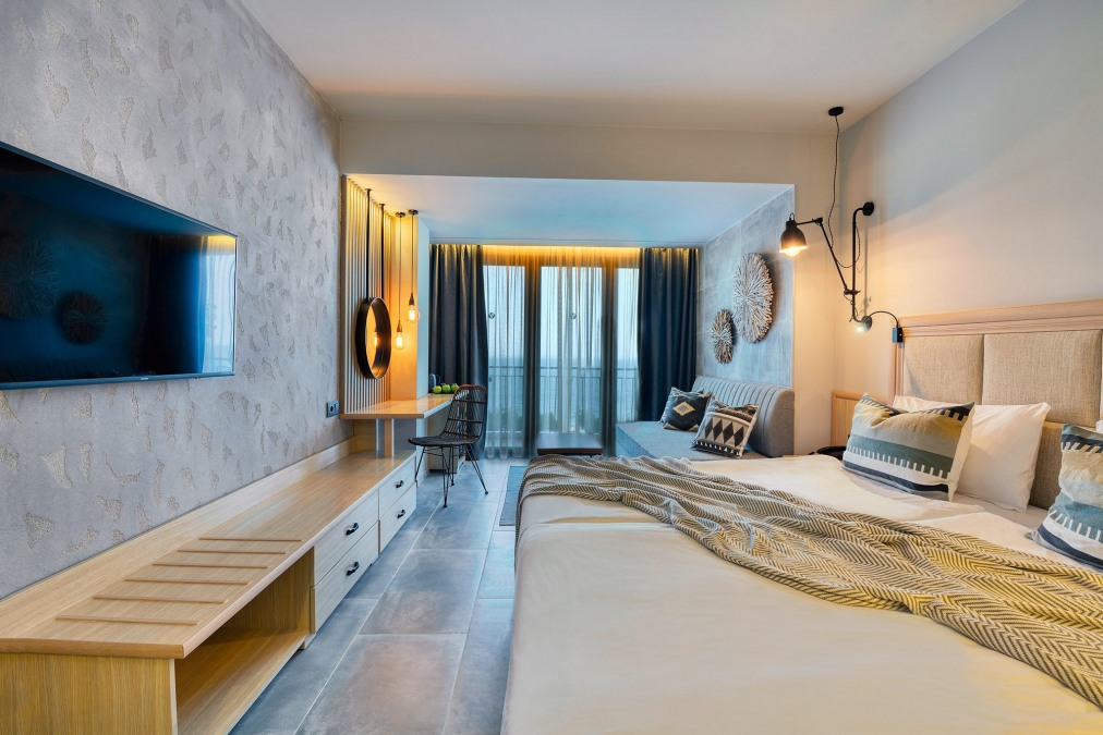 Двойна стая Концепт 16+ (25-30 кв.м.). С директен изглед море, на висок етаж. Двойно легло, малък диван. За макс. 2-ма