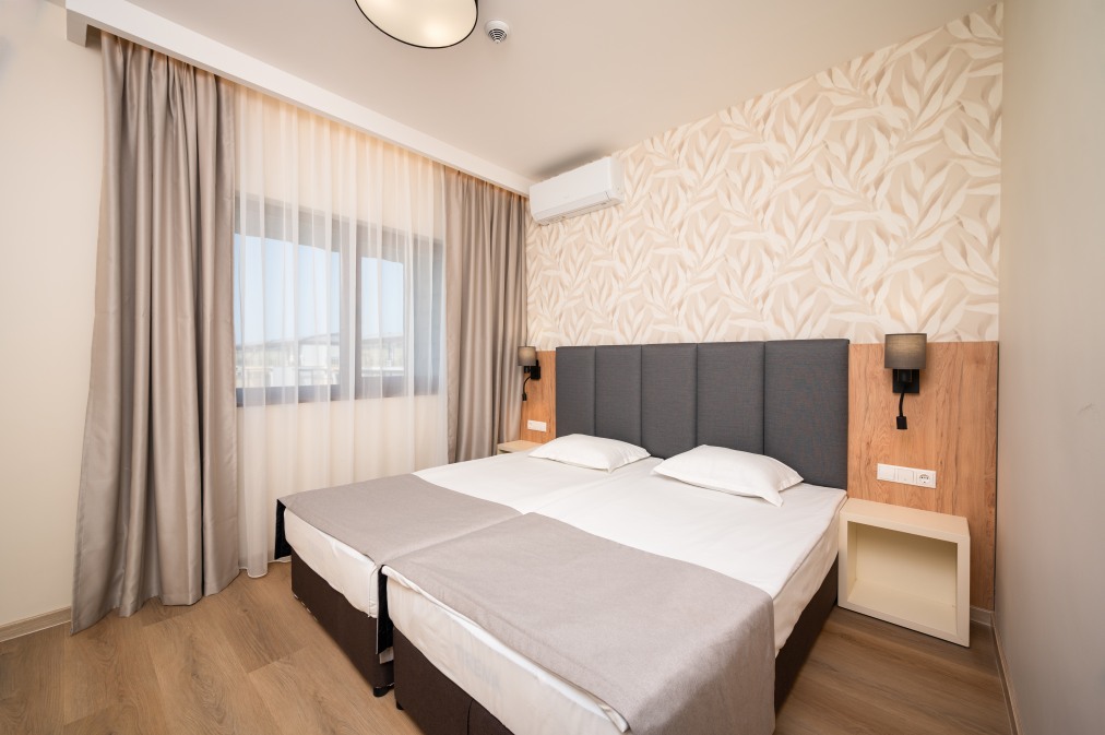 Двуспален апартамент (80 кв.м.). Състои се от две спални с двойно легло и всекидневна с разтегателен диван и кухненски кът. За макс. (4+2)